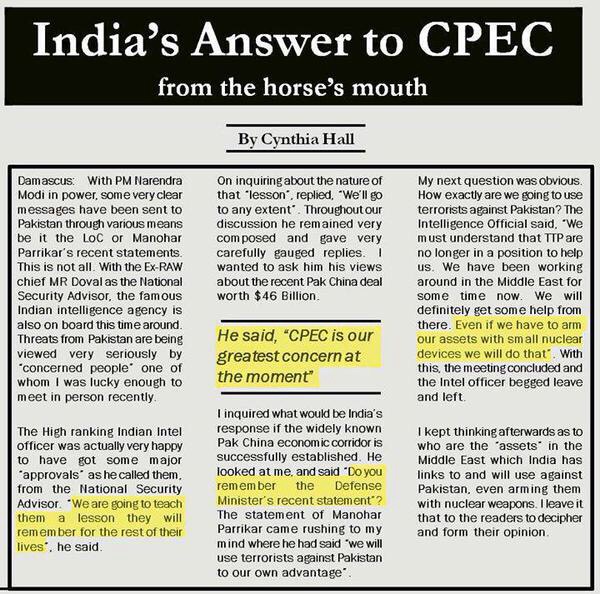In this regard, the above posted article of Cynthia Hall further exposes the declared intentions of Indian government to even explode a crude nuclear device using its proxy ISIS terrorists, to force China to abandon its CPEC projects.