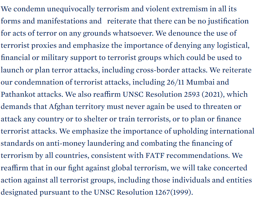 “We condemn unequivocally terrorism and violent extremism in all its forms and manifestations and reiterate that there can be no justification for acts of terror on any grounds whatsoever. We denounce the use of terrorist proxies and emphasize the importance of denying any logistical, financial or military support to terrorist groups which could be used to launch or plan terror attacks, including cross-border attacks. We reiterate our condemnation of terrorist attacks, including 26/11 Mumbai and Pathankot attacks. We also reaffirm UNSC Resolution 2593 (2021), which demands that Afghan territory must never again be used to threaten or attack any country or to shelter or train terrorists, or to plan or finance terrorist attacks. We emphasize the importance of upholding international standards on anti-money laundering and combating the financing of terrorism by all countries, consistent with FATF recommendations. We reaffirm that in our fight against global terrorism, we will take concerted action against all terrorist groups, including those individuals and entities designated pursuant to the UNSC Resolution 1267(1999).”